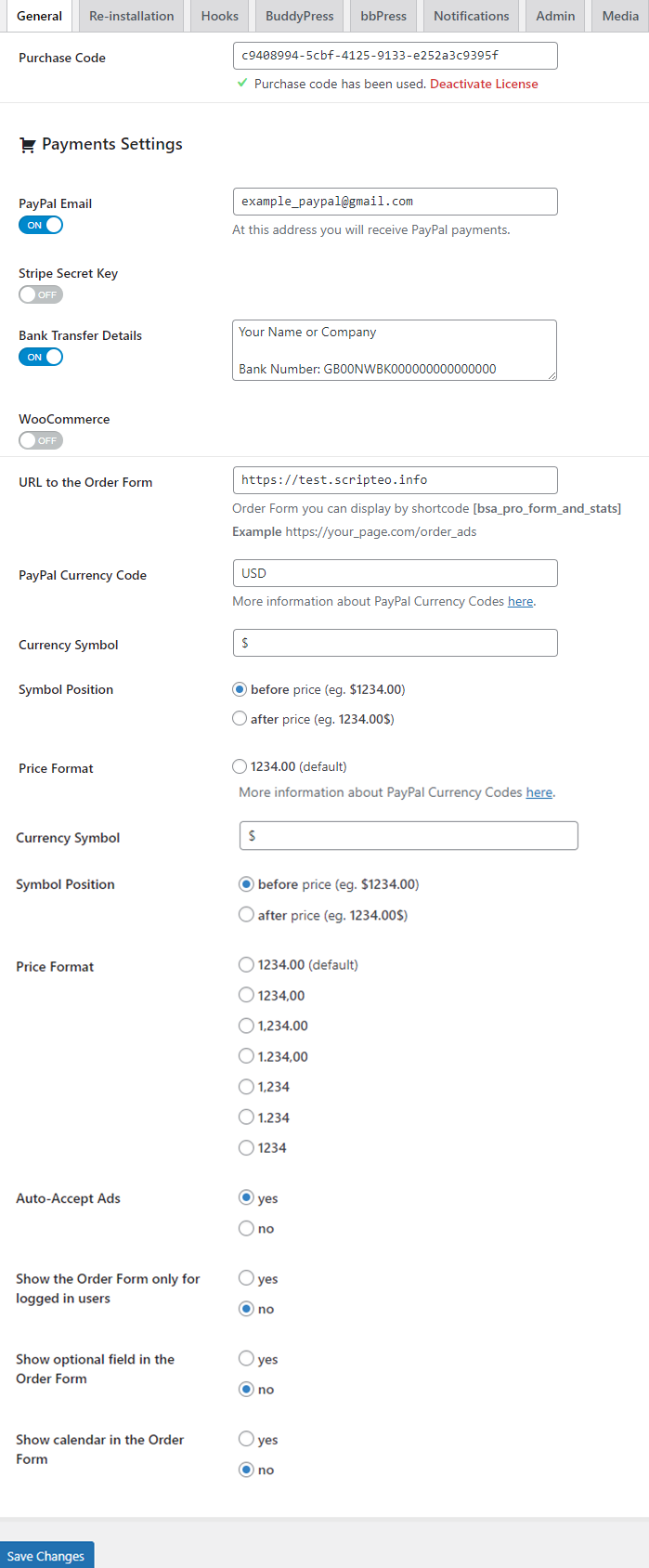 URL del formulario de pedido : pegue aquí la URL del formulario de pedido. Puede mostrar el formulario de pedido con este código corto: [bsa_pro_form_and_stats]
