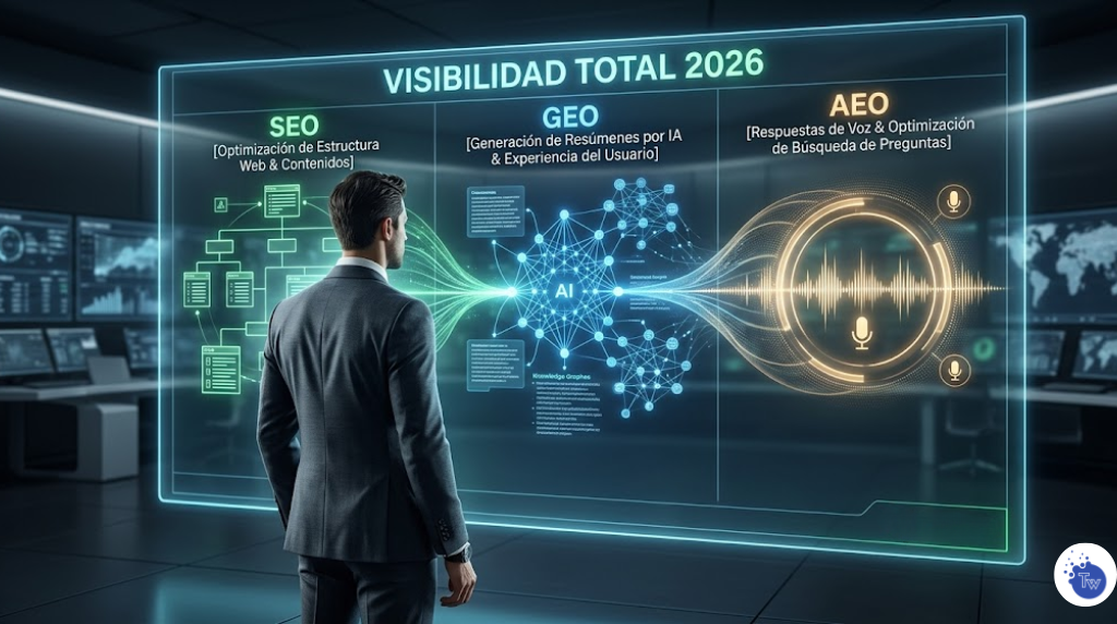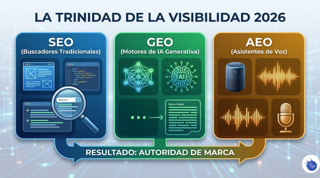 En 2026, la visibilidad digital depende de tres pilares: el SEO para la infraestructura web, el GEO para ser la fuente de confianza de las IAs generativas y el AEO para dominar las respuestas directas por voz. Si tu estrategia no integra los tres, estás perdiendo el 60% de los puntos de contacto con tu audiencia.